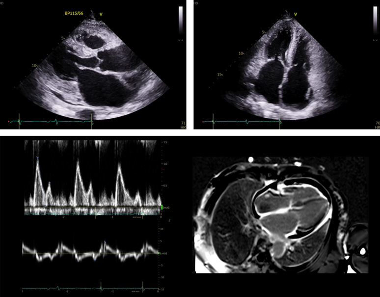 심초음파검사상 left ventricle과 right ventricle에 diffuse한 wall thickening과 함께 bi-atrial enlargement가 저명하며 mitral inflow와 tissue Doppler상 restrictive pattern이 관찰되어 amyloidosis에 의한 restrictive cardiomyopathy가 의심된다.