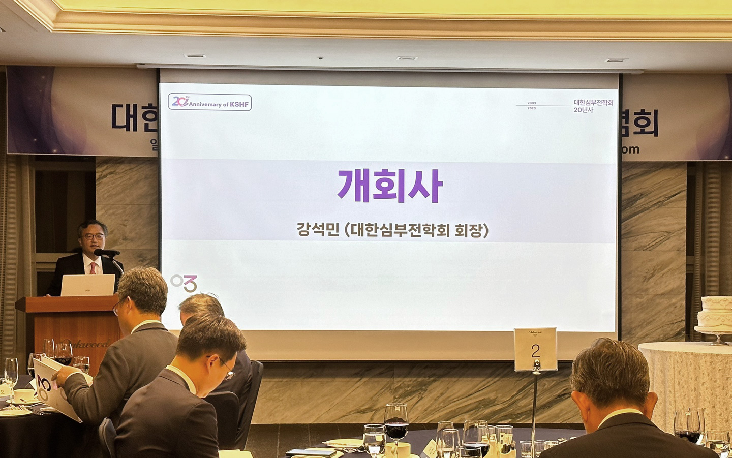 그리고 11월 1일에는 백서 발간을 기념하여 출판기념회도 개최되었습니다. 오크우드 프리미어 코엑스 센터에서 진행된 행사에는 제2대 회장이신 오병희 교수님과 중증 심부전연구회 초대회장이신 김재중 교수님, 현 임원진 및 위원들을 초청하여 행사를 성대하게 치렀습니다. 또한 심장학회 및 관련 유관학회, 해외 저명인사들도 축하 영상을 보내주시어 심부전학회의 20주년을 축하해주셨습니다.