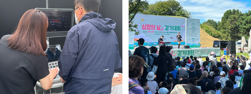 The event was organized by the Korean Society of Cardiology. The Korean Society of Echocardiography set up a booth to demonstrate carotid ultrasound, offering participants a hands-on experience related to cardiovascular health. The booth was met with great enthusiasm, and reservations were fully booked within about five minutes after registration opened.