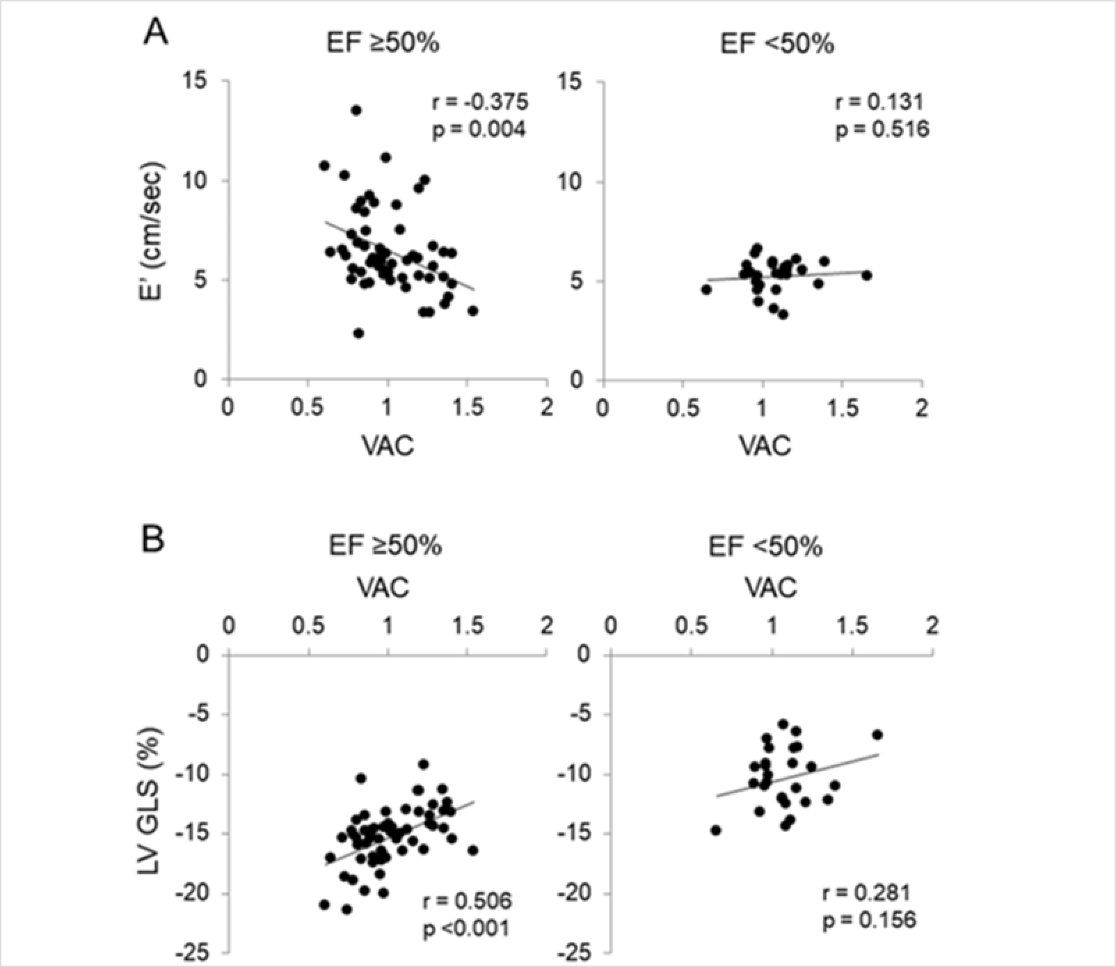 In conclusion, these findings confirmed that the relationship between hemodynamic parameters and both diastolic and systolic function of the left ventricle differs depending on EF status. Moreover, the mechanical interaction between the ventricle and arterial system varies according to the level of left ventricular systolic function.