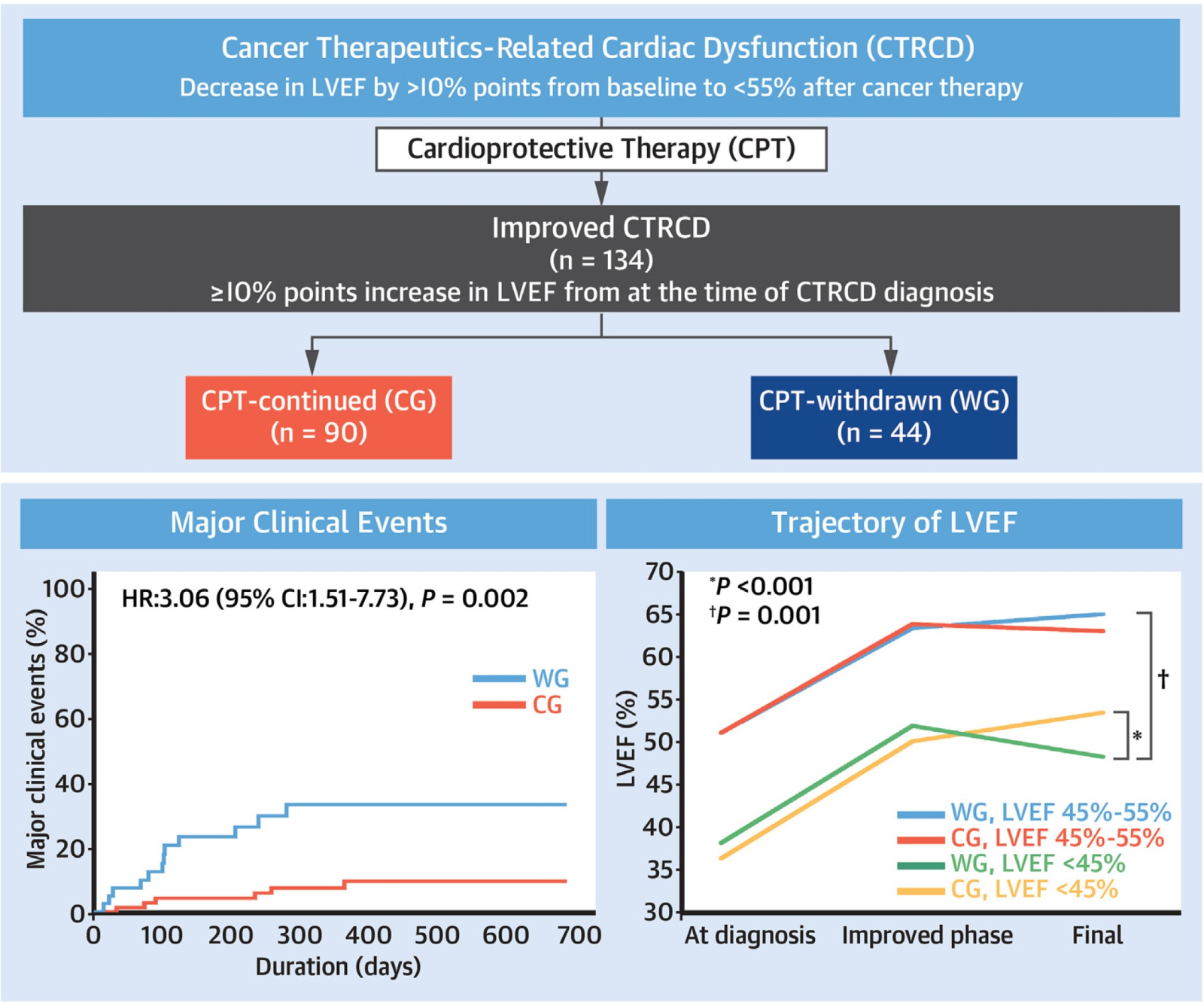 분석 결과, CPT 중단군에서는 CPT 유지군에 비해 유의하게 많은 주요 임상 사건이 발생하였습니다 (HR 3.06; 95% CI 1.51-7.73, P = 0.002). 또한 약물치료 후 심기능이 호전된 환자라 할지라도 진단 당시 좌심실박출률이 45% 미만이었던 환자군에서는 CPT 중단 후 유의한 좌심실박출률 감소를 보였습니다. 따라서, “본 연구에서는 CTRCD 환자에서는 약물치료의 중단이 심부전으로 인한 입원 및 심장 기능의 재악화와 같은 주요 임상 사건의 발생 위험 증가와 연관이 있으며, 특히 진단 시 심장 기능의 손상이 심했던 환자에게서는 약물 치료 중단에 따른 심장 기능의 재악화가 더 빈번함을 확인하였다”고 요약할 수 있습니다.