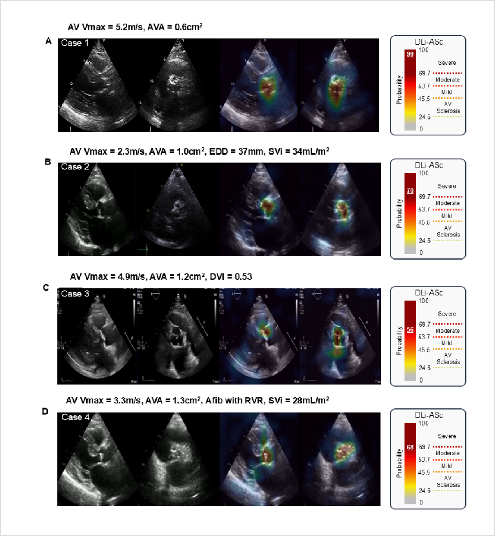 (A) 전통적인 도플러 지표와 DLi-ASc 모두 severe AS를 일치하게 진단한 경우.