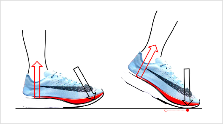 카본 플레이트의 반발력을 통해, 착지할 때 지면으로 가해지는 힘이 전진 에너지로 전환됩니다.