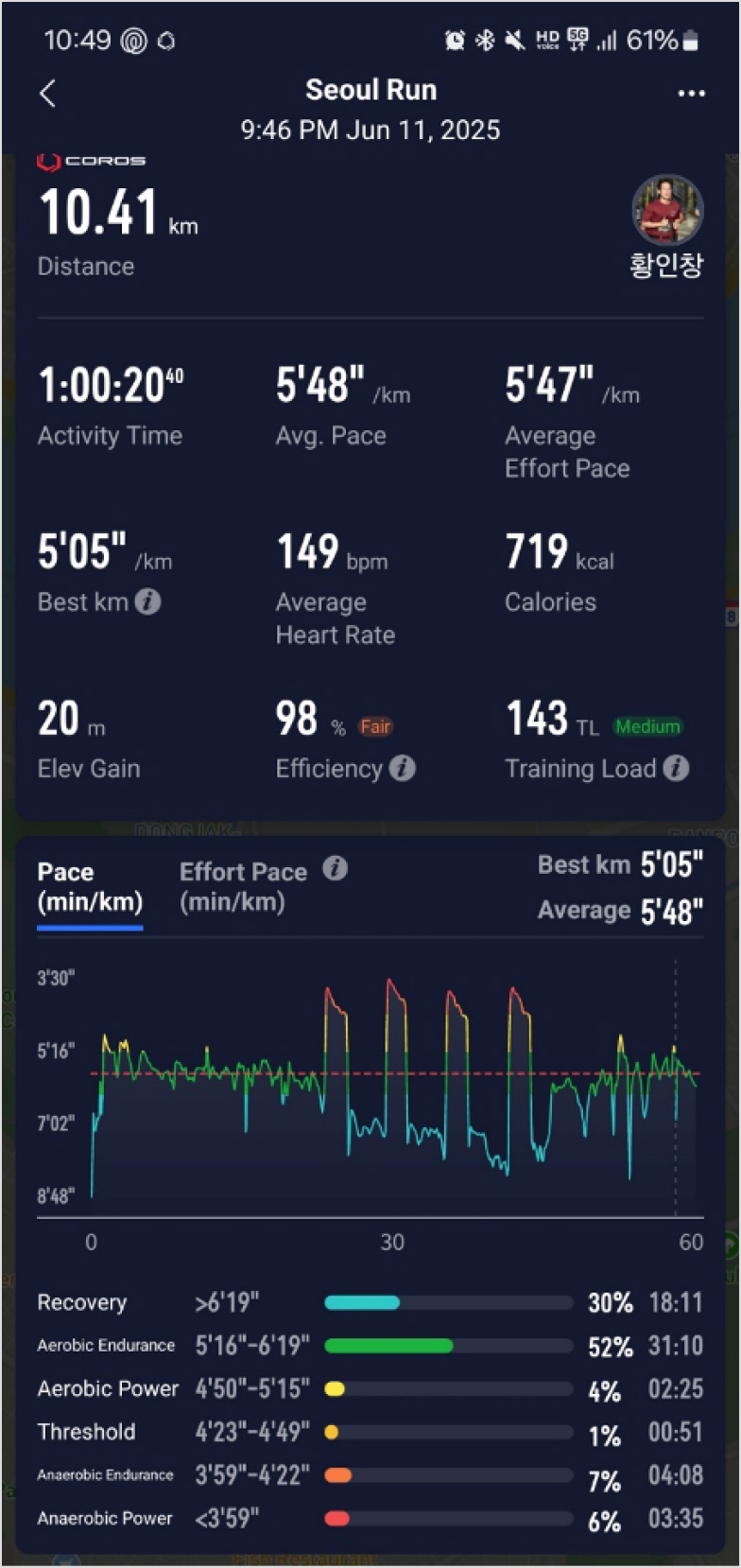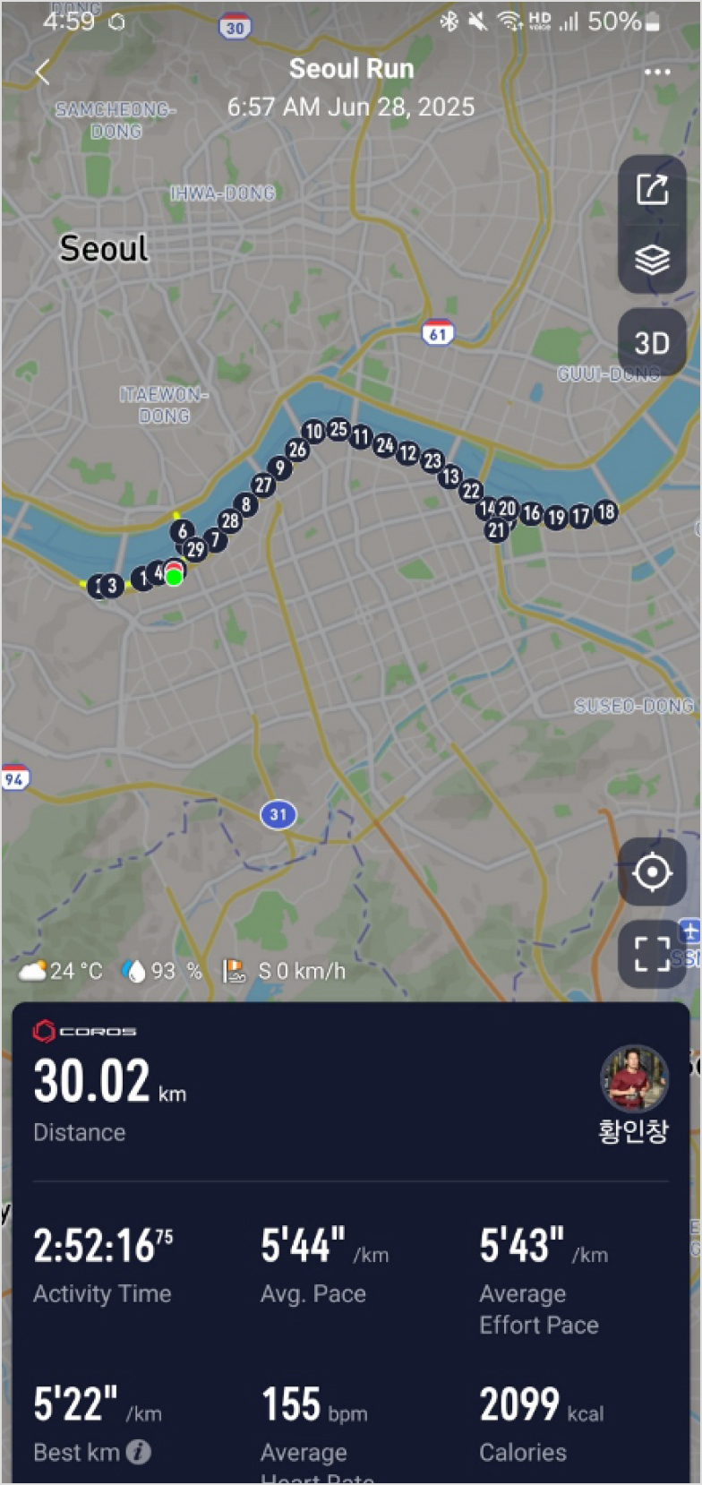 중간에 비가 많이 오고 추워서 고생했지만, 후반부에서 페이스가 많이 떨어지지는 않았고,