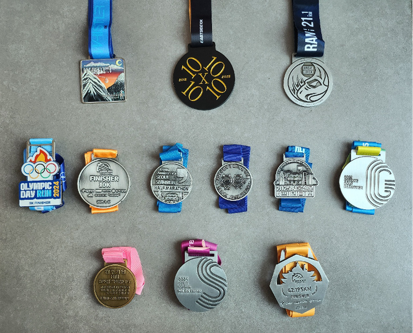 지금까지 제가 참가한 마라톤 대회는 총 12개였고, 이 중 풀코스는 3회였습니다. 적게는 수천 명, 많게는 수만 명이 함께 뛰며 대회의 설렘을 나누고, 수많은 응원을 받으며 고비를 넘기는 경험은 그 자체로 특별한 축제입니다. 힘든 구간을 버텨내며 골인 지점을 통과할 때의 감정은, 말로 표현하기 어려울 정도의 뿌듯함과 성취감을 안겨줍니다. 마라톤 대회는 실력과 무관하게 누구나 참가할 수 있으며, 완주만 해도 기념 메달을 받을 수 있습니다. 예전에 받았던 완주 메달을 보고 있으면, 그날의 분위기, 달렸던 코스의 풍경과 응원하던 관중들, 그리고 그 순간의 감정들이 떠올라서 소중한 추억이 됩니다