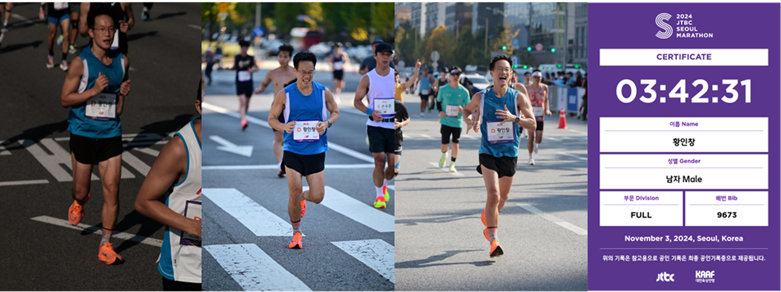 왼쪽 사진은 20km 지점, 가운데 사진은 일반적으로 가장 힘들게 느껴지는 35km 지점, 오른쪽 사진은 몸은 이미 지칠 대로 지쳤지만 표정은 한없이 밝아지는 골인지점
