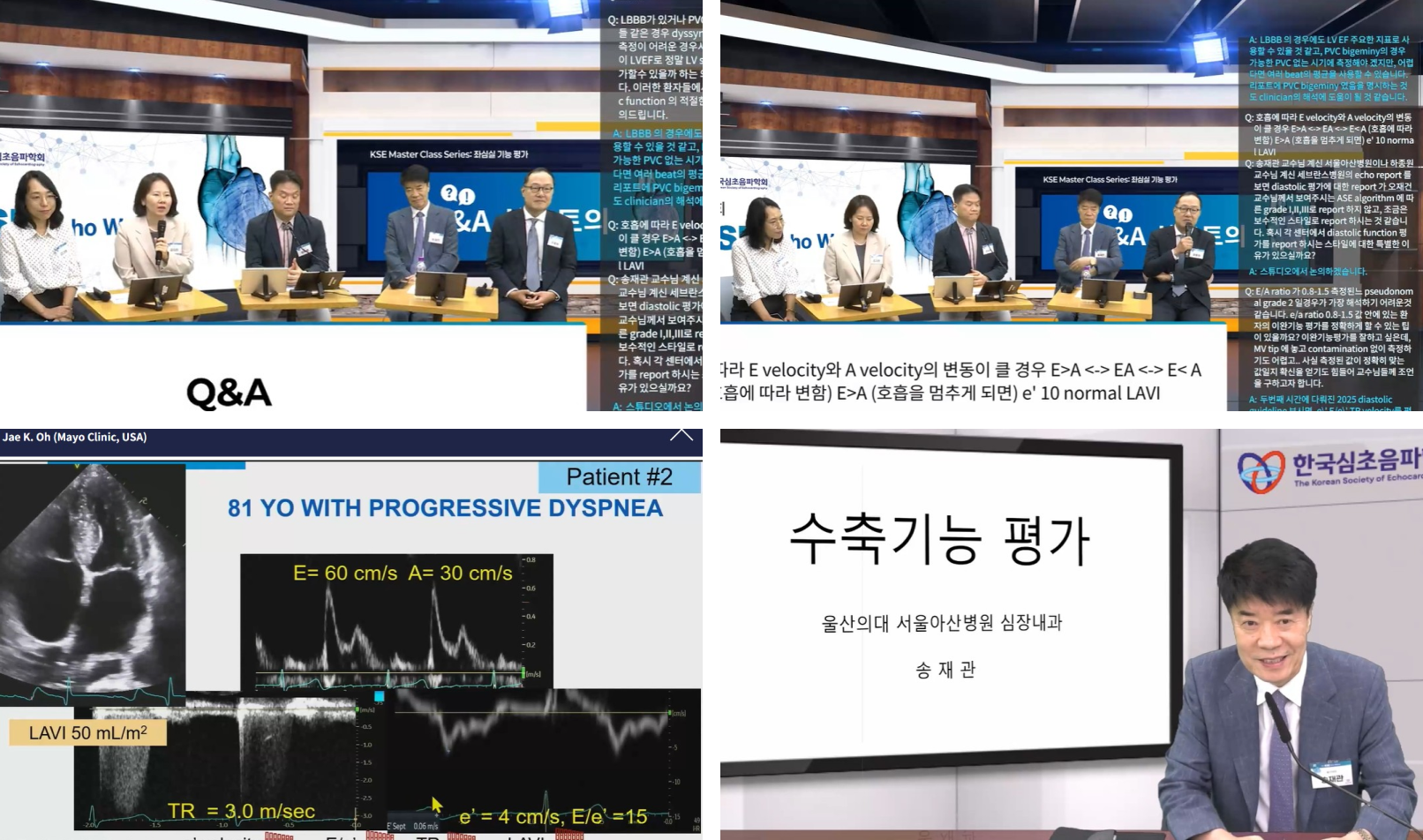 Professor Song Jae-kwan passionately delivered his lecture, starting with the basics that should never be overlooked—such as selecting appropriate gain values to accurately delineate the endocardium based on quality cardiac images and ensuring continuous respiratory control during examinations. He went beyond emphasizing proper image acquisition methods to discuss commonly overlooked issues in the examination room, such as whether stroke volume values might be measured incorrectly due to various errors or whether truly low SV values were accurately measured, using appropriate case examples for each situation. Professor Oh Jae-geon's lecture provided an update on the overall ASE guidelines for diastolic function assessment released this year. He clearly explained how the new guidelines have become more intuitive and clinically applicable compared to the previous guidelines, which contained somewhat ambiguous content. The very next day, we removed the old diastolic function assessment charts from the previous guidelines posted throughout our echo lab and replaced them with the new diagnostic criteria flowcharts to evaluate diastolic function. During Professor Ha Jong-won's case-based lecture on the clinical application of left ventricular function assessment, the impressive points included the caution needed when using beta-blockers in patients showing restrictive physiology, the clinical application of using mitral inflow to assess not only diastolic function but also volume status in patients with various clinical illnesses, and the usefulness of exercise stress echo.